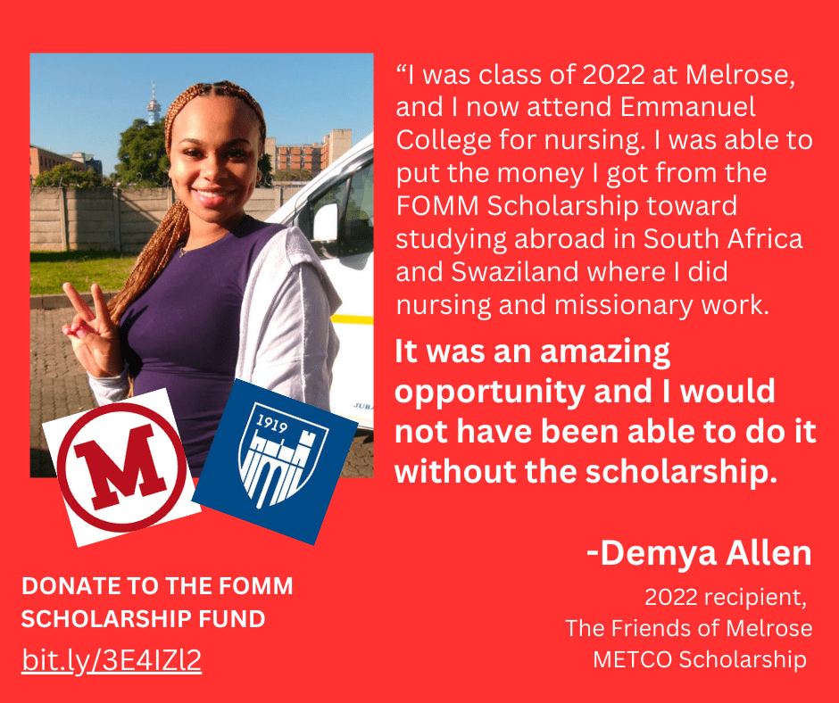 Every year, the Friends of Melrose METCO (FOMM) awards a scholarship to a Melrose High School senior in the METCO program who has been a role model for promoting good relationships among all students.